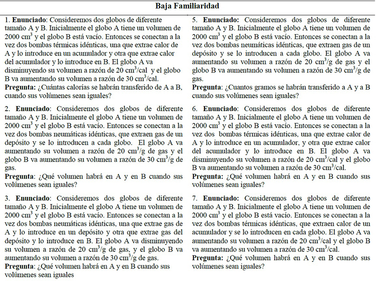 Se diseñaron dos colecciones, cada una de 8 enunciados de problemas algebraicos, cuya resolución implica un sistema de 2 ecuaciones lineales con 2 incógnitas en todos los casos. En una colección, las superficies implicaron temáticas científicas consideradas de Baja Familiaridad para los estudiantes. En estos problemas se procuró reducir al mínimo las diferencias entre problemas, escogiendo objetos y eventos de fácil representación mental para los estudiantes (globos que se hinchan o se deshinchan mediante bombas que inyectan o extraen gas o calor), de modo que las diferencias superficiales se concentrasen en las magnitudes implicadas al tratar como fenómenos dichos eventos. Esta colección se utilizó en ambos estudios 1 y 2.