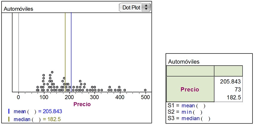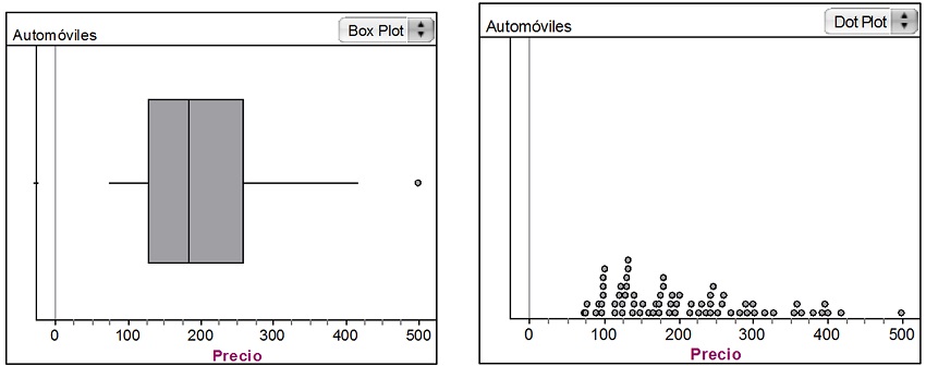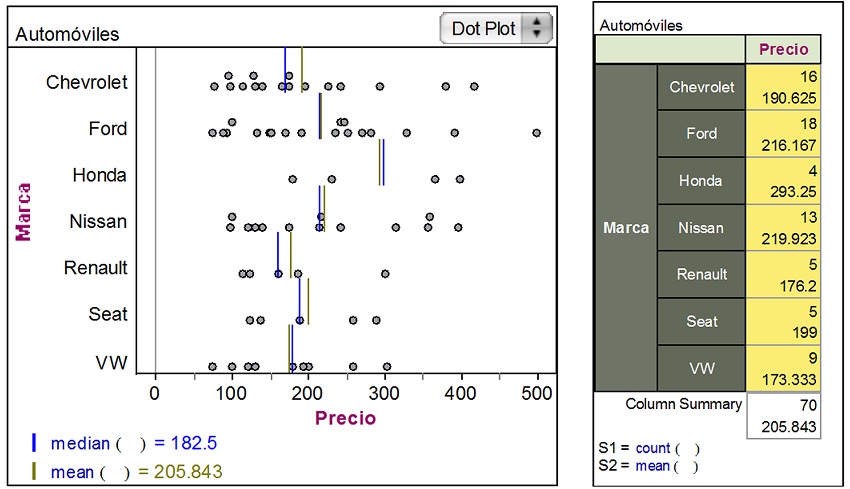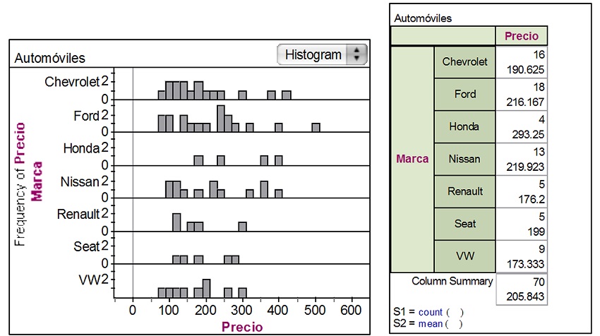 Se puede ver fácilmente que más del 50% del total de los automóviles tienen un precio que está entre los 90,000 y los 250,000 pesos. La media aritmética del precio de los automóviles es de 205.8. El precio más bajo es de 73,000 pesos y el más alto es de 499,000 pesos (ambos son de la marca Ford)