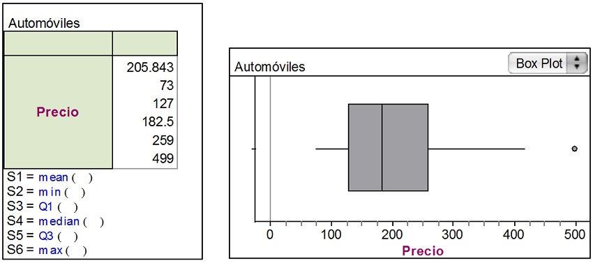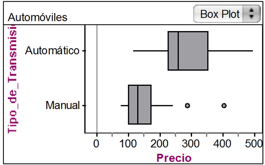 René ha obtenido mayor información de la gráfica al visualizar variabilidad, centro y realiza una comparación correcta al establecer que el precio de los automáticos es del doble de los manuales. Comete el error de confundir la mediana con la media. Atanael, por su parte, corresponde al grupo de los alumnos que, además del diagrama de cajas, elaboró una tabla con medidas descriptivas.