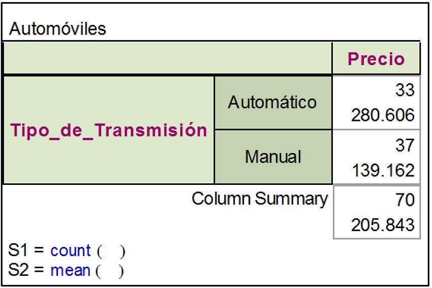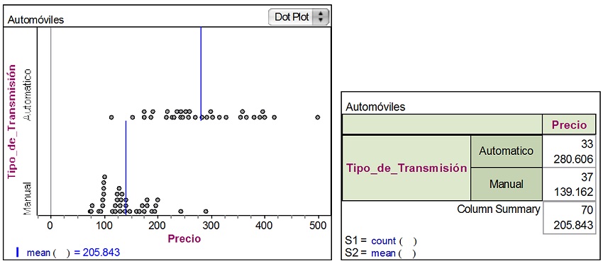 Puede verse que el alumno complementa las dos representaciones, el diagrama de caja le permite realizar la aseveración: la transmisión automática es más cara que la manual en la mayoría de los casos, mientras que la tabla le permite precisar los valores de la media. Comete el error de la media.