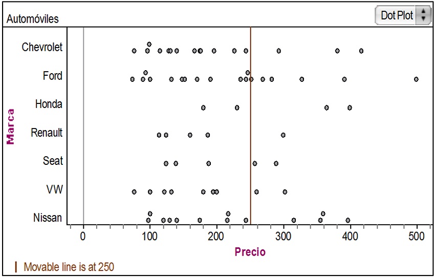 La representación más utilizada por los estudiantes fue la tabla con medidas descriptivas; en algunos casos solo con conteos y medias, en otros casos con diversas medidas descriptivas como valores mínimos, máximos, cuartiles y desviación estándar. Es importante señalar que 22 estudiantes utilizaron estas tablas en complemento con una representación gráfica, y fue el principal elemento de decisión para responder la pregunta planteada. Por su parte, la representación gráfica más utilizada por fue el diagrama de puntos (marca contra precio) llegando en algunos casos a colocar líneas que indican el precio medio, lo que ayudó a los estudiantes a definir las tres marcas más económicas (ver figura 11) como se había previsto.