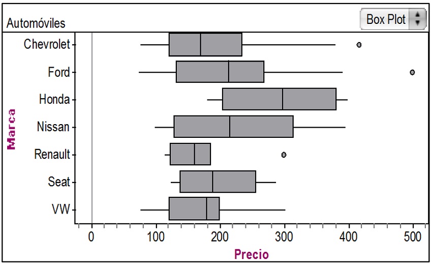 Otra representación, que fue utilizada en forma aislada y que en nuestro análisis a priori habíamos previsto que podría ser utilizada con mucha frecuencia, es el diagrama de cajas. Sin embargo, no ocurrió así y solo fue utilizada por dos estudiantes en complemento con una tabla descriptiva que no era totalmente necesaria. El diagrama de cajas será suficiente para decidir a través de la mediana las tres marcas más económicas, como se muestra la gráfica construida por Jesús (ver figura 14).