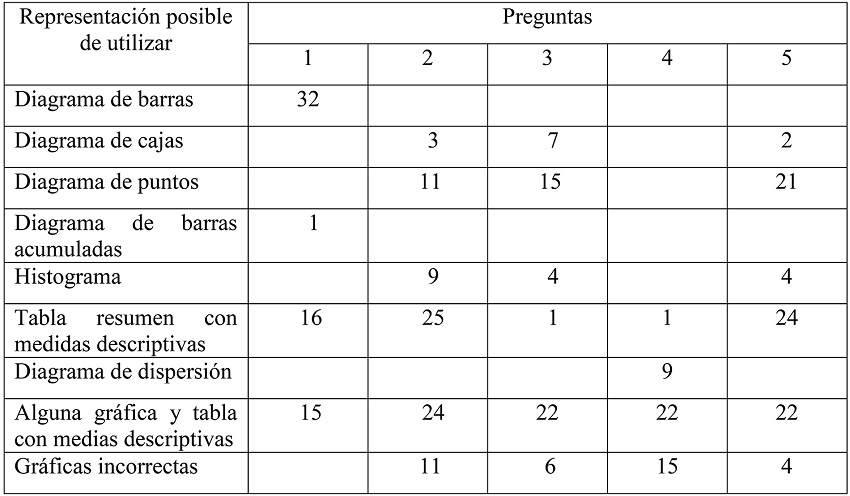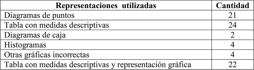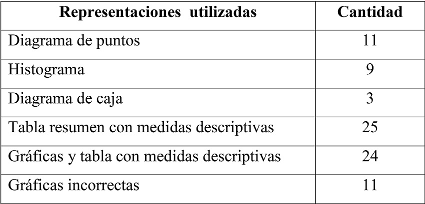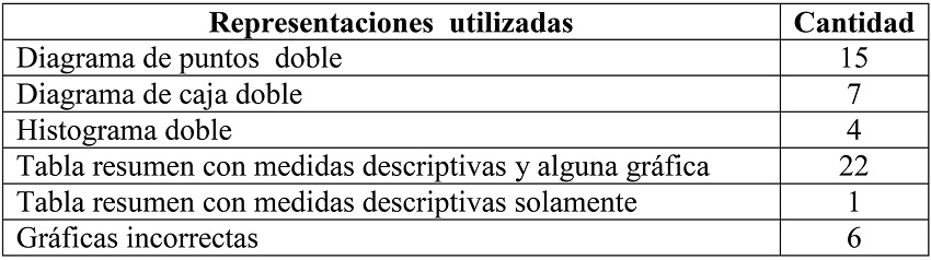 Del Figura 5 se observa que 24 estudiantes utilizaron más de una representación (gráficas y tablas) para responder la pregunta planteada. Entre quienes construyeron tablas hubo variación en cuanto a las medidas descriptivas que utilizaron: 15 solo calcularon la media y/o mediana, 7 calcularon las cinco medidas resumen (mediana, mínimo, máximo, primer cuartil y tercer cuartil) y 2 utilizaron la opción de medidas básicas que ofrece el software (media, desviación estándar, conteo, error estándar y datos faltantes).