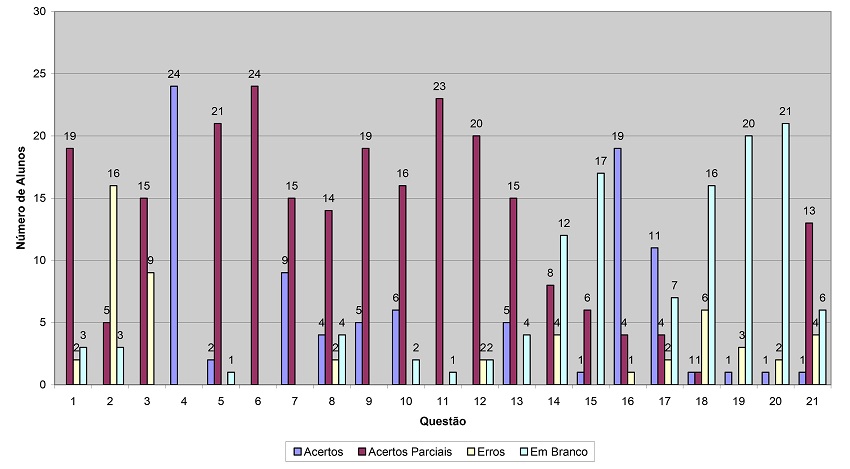 O gráfico a seguir foi estruturado a partir do caderno de atividade que foi composto de 21 atividades para ampliar o conceito de função e analisar a recepção do vídeo, marcadas no eixo X e o quantitativo de alunos no eixo Y. Foram categorizadas quatro possíveis alternativas de enquadramento dos alunos: 1º) Acertos para quem respondeu corretamente a questão; 2º) Acertos parciais para quem teve acerto igual ou maior a cinquenta por cento da questão; 3º) Para quem errou a questão ou acertou menos de cinquenta por cento; e 4º) Em branco para quem não respondeu.