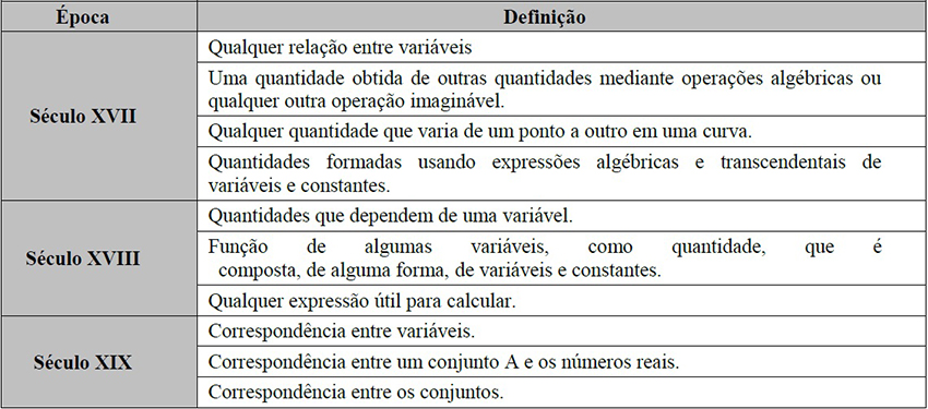Vazquez, Rey e Boubée (2008) apresentam um pequeno resumo sobre as definições do conceito de função ao longo dos séculos: