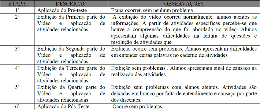 As atividades foram ordenadas da seguinte forma: 1) aplicação do Pré-Teste; 2) exibição do Vídeo; 3) resolução do Caderno de Atividades; e 4) aplicação do Pós-Teste. No entanto, como o Vídeo foi divido em quatro partes, ao final de cada seção, foram resolvidos os exercícios referentes à exibição.