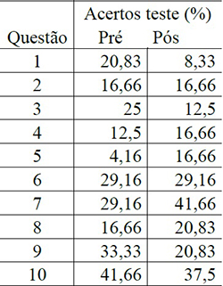 Com a proposta de promover uma avaliação inclusiva e que permitisse analisar a contribuição da intervenção proposta nesse processo de ensino-aprendizagem, optou-se por realizar uma averiguação prévia dos conceitos, chamada de Pré-Teste e outra após este processo, com o mesmo instrumento avaliativo. Esse foi composto de 10 questões fechadas, com 4 ou 5 alternativas, porém uma única resposta correta.