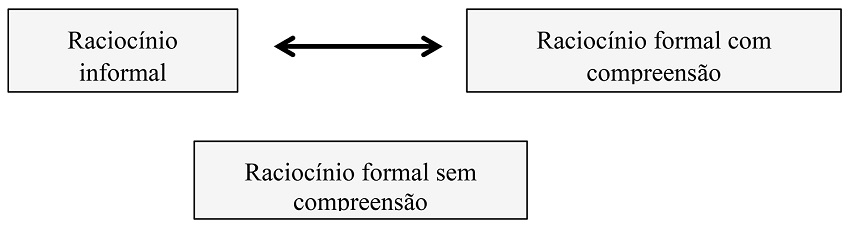 Note-se que o raciocínio formal segue regras e procedimentos matemáticos já conhecidos, mas pode ser realizado em duas condições: de modo mecânico, por simples execução dos passos memorizados, ou com compreensão da razão de ser desses passos e do procedimento geral que se está a seguir (Figura 1). Esta compreensão tem por base analogias e conexões com situações bem conhecidas, sejam situações matemáticas ou do dia a dia do aluno. Note-se que tanto o raciocínio informal como o formal pode ser matematicamente correto ou incorreto. Gravemeijer (2005) considera que o grande problema do ensino da Matemática é saber como promover a articulação progressiva entre os processos de raciocínio informais e formais, sustentando que a valorização de processos de raciocínio informais ajuda a encurtar o fosso entre o conhecimento pessoal informal dos alunos e o seu conhecimento formal em desenvolvimento. A nossa perspectiva é que o raciocínio formal com compreensão se desenvolve num processo de vaivém sobretudo a partir do raciocínio informal.