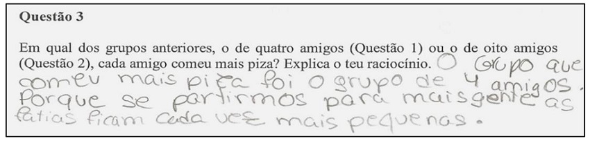 porque se distribui a mesma pizza por mais pessoas e, por isso, as fatias são menores, o que constitui uma importante generalização. Fazem assim um raciocínio informal onde atribuem significado aos procedimentos e mostram compreender de uma forma intuitiva a relação existente entre
