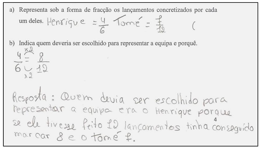 , a aluna utiliza a noção de equivalência de frações e um procedimento para obter frações equivalentes. Refere que, se ambos os jogadores fizessem 12 tentativas, o Henrique concretizaria mais lançamentos. Para ilustrar a sua resposta, transforma