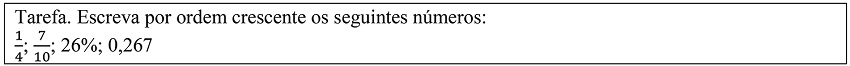 Esta tarefa apresenta um contexto puramente matemático. Pede-se aos alunos que ordenem um conjunto de quatro números racionais apresentados em diferentes representações: fração, decimal e percentagem.