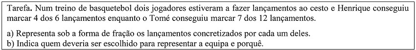 Tarefa. Num treino de basquetebol dois jogadores estiveram a fazer lançamentos ao cesto e Henrique conseguiu marcar 4 dos 6 lançamentos enquanto o Tomé conseguiu marcar 7 dos 12 lançamentos.
