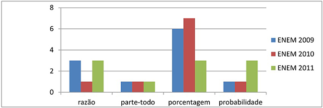 O significado razão foi mobilizado em 24,1% dos itens analisados dos ENEM de 2009 a 2011, tendo sofrido uma redução no número de itens mobilizados no ENEM 2010 (apenas1 item), em relação ao ENEM 2009 (três itens), mas voltou a ser mobilizado em três itens no ENEM 2011. O significado porcentagem foi o mais abordado, correspondendo a 58,6% dos itens analisados dos ENEM de 2009 a 2011, tendo sofrido uma redução nos itens que envolviam esse significado no ENEM 2011, o qual apresentou uma uniformidade nos significados razão, porcentagem e probabilidade.