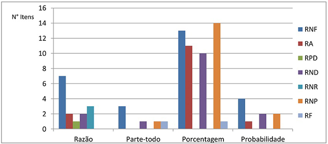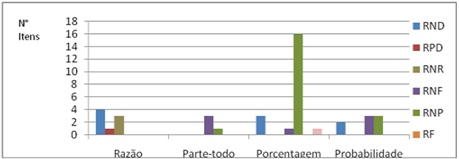 O registro algébrico é bastante mobilizado no significado porcentagem (11 dos 16 itens), nas estratégias que envolvem o raciocínio proporcional e só não foi utilizado nos itens que envolvem o significado parte-todo. O registro potência de dez e o numérico razão foram mobilizados apenas no significado razão, o qual não apresentou itens que mobilizassem o registro percentual. O registro figural foi mobilizado apenas nos significados parte-todo e porcentagem.