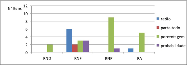 O gráfico 8 apresenta os registros de representação dos números racionais que podem ser mobilizados na resolução dos vinte e nove itens, de acordo com o significado em que foi abordado.