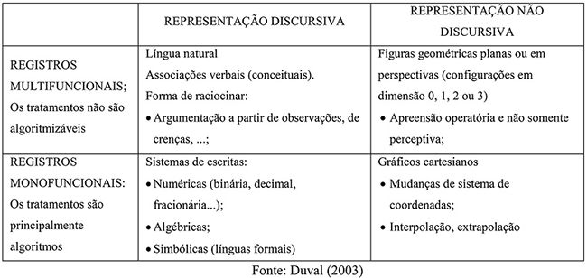 De acordo com Duval (2003), existem quatro tipos diferentes de registros em Matemática, discriminados no quadro 1.