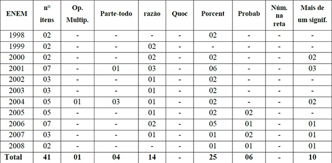 As provas de conhecimentos gerais dos ENEM de 1998 à 2008 apresentaram uma média de 3,5 itens, por prova, que contemplam algum tipo de significado e representação dos números racionais, o que corresponde a aproximadamente 5,6% do total de 63 itens que cada prova continha.