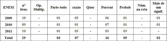 Entre as provas de Matemática e suas tecnologias do novo ENEM, que corresponde ao período de 2009 à 2011, foram encontrados, em média, 9,6 itens por prova que abordam algum tipo de significado e representação dos números racionais, correspondendo a aproximadamente 21% do total de 45 itens da prova. Esse resultado pode indicar a necessidade e a importância do aluno saber mobilizar o conceito dos números racionais na resolução dos itens do ENEM.