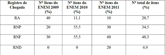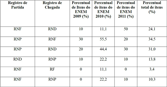 O registro numérico percentual foi o que mais esteve presente na estrutura dos itens dos ENEM 2009 a 2011 (62,6%, em média), embora no ENEM 2011, o significado porcentagem não tendo sido o mais abordado. O registro potência de dez só esteve presente no ENEM 2009 e o figural (dos números racionais), apenas no ENEM 2010, ambos com uma única questão.