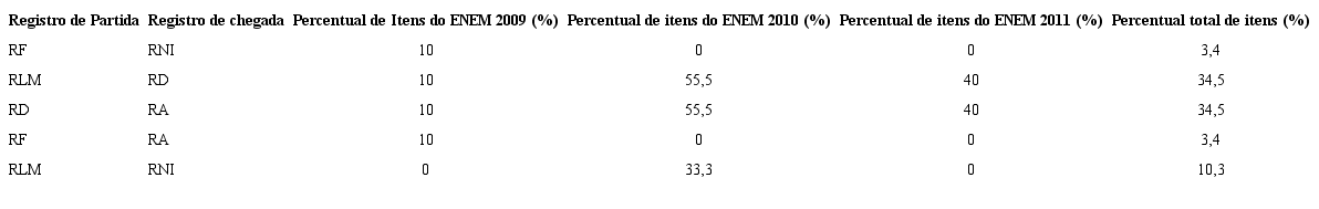 As conversões entre outros tipos de registros podem ocorrer nas estratégias de resolução de 48,2% (14 itens) do total de itens analisados dos ENEM de 2009 a 2011, e estão relacionadas no quadro 6.