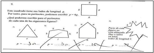 En la figura 1 se pueden apreciar las respuestas de dos de los usos más habituales que los estudiantes de este nivel atribuyen a las letras: letra como objeto y letra ignorada. En el ítem 9 (b), el estudiante responde que el perímetro de la figura es p = 5e. En este caso el estudiante identifica las letras presentes como objetos (los lados de la figura), asociando a la letra e un valor desconocido, según manifestó el estudiante en la entrevista posterior. Por otra parte, se puede advertir en el ítem 9 (c), que el mismo estudiante ignora las letras presentes al afirmar que el perímetro de esa figura es: p = 16.