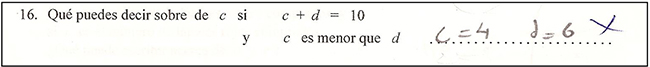 Estudiante: Como dice que c y d, deben sumar 10, entonces dividí 10 entre 2 y me dio 5. Después dice que c es menor que d, por lo que d es 6 y c debe ser 4.