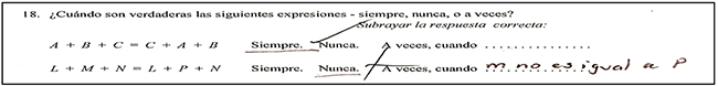 Esta respuesta concuerda con un patrón repetitivo de soluciones a este ítem. Específicamente 20 de los 35 estudiantes ubicados en este nivel dieron como respuesta Nunca, lo que nos llevó a suponer que la fuente del error que ocasionaba las respuestas incorrectas podría ser que los estudiantes consideraban las letras como objetos o que letras distintas no pueden tener valores iguales.