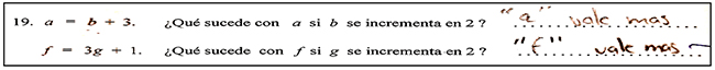 En este caso hacemos especial énfasis en las tareas 3 y 19, las cuales presentan la mayor frecuencia de respuestas erróneas entre los estudiantes ubicados en el nivel 3. Estas dos tareas son las de más alta exigencia cognitiva, ya que para responderlas de manera correcta los estudiantes deben de involucrar la comprensión del uso y significado de las letras como números generalizados y como variable. Para la tarea 3, el 87.5% de los estudiantes expresaron una respuesta incorrecta, mientras que casi el 83% contestaron de manera incorrecta la tarea 19. En ambos casos se advirtió que la mayoría de los estudiantes, tienden a emplear las letras como incógnitas de valor específico. Estos registros altos en las respuestas incorrectas, nos corroboran la falta de conocimientos de los estudiantes de este nivel para el manejo y comprensión de las letras como números generalizados y como variables; así mismo, se encontraron bastantes evidencias de estudiantes, que a pesar de estar ubicados dentro de uno de los niveles de mayor exigencia cognitiva en el manejo de las letras, continúan con su tendencia a utilizar las letras como objetos, como se identificó en las respuestas encontradas en el ítem 18 (b) (Figura 3).
