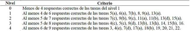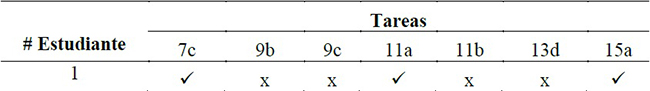 La tabla 1 muestra que el estudiante contesta correctamente () a cuatro tareas e incorrectamente (x) a dos de las diseñadas para el nivel 1. Es decir, responde correctamente al menos a 4 de las 6 tareas de ese nivel, cumpliendo con suficiencia la condición requerida en el Cuadro 1. Para completar nuestra valoración, evaluamos las respuestas a las tareas consideradas en el nivel 2, no cumpliendo con el número mínimo de respuestas correctas de las tareas requeridas de ese nivel, 5 de 7, como muestra la tabla 2.