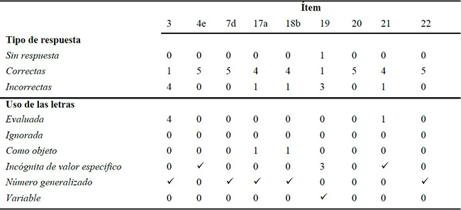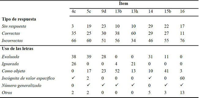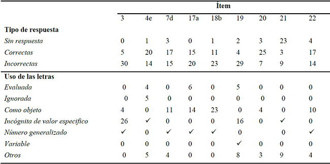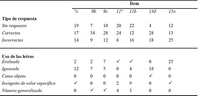 Este análisis nos brinda evidencias de que, aproximadamente, el 80% de los estudiantes sólo son capaces de reconocer el uso de las letras evaluadas, letras como objetos y letras como incógnitas con valor específico. Además, se detectó la recurrencia de ignorar, en una gran cantidad de respuestas de estos alumnos, la presencia de las mismas en las expresiones algebraicas que se les presentaron.