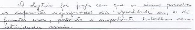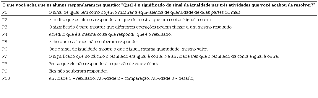 Também nos chamou a atenção o fato de que os professores, ao responderem o questionário, não citaram aimportância de os alunos compreenderem os diferentes significados do sinal de igualdade, com vistas aos estudos posteriores, quando iniciam a aprendizagem de álgebra e das equações.