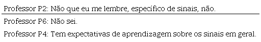 Na dinâmica de interação coletiva realizada com os professores, retomamos a questão do conhecimento curricular, no que tange aos diferentes significados do sinal de igualdade, na expectativa de aprofundar as análises obtidas com os dados produzidos anteriormente. Diante da pergunta "Vocês sabem se este conceito matemático está contemplado em alguma expectativa de aprendizagem do Ensino Fundamental do Ciclo I ou do Ciclo II?". Todos os professores relataram que desconheciam a existência de expectativas de aprendizagem em relação aos diferentes significados do sinal de igualdade no Ciclo II e alegaram que esses documentos não são de seu conhecimento. Vejamos: