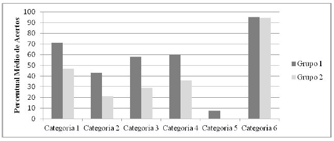 Investigaram-se também, por meio desse instrumento, as categorias de problemas do WASI em que os estudantes apresentaram melhor e pior desempenho. Os dois grupos demonstraram pior desempenho na categoria de Problemas de Resolução Matemática, já que aproximadamente 92% dos estudantes não apresentaram nenhum acerto nos problemas dessa categoria. No grupo 1, apenas três estudantes responderam corretamente um dos dois problemas de Resolução Matemática. Já no grupo 2, não houve acertos nos problemas dessa categoria. A categoria em que ambos os grupos apresentaram melhor desempenho foi a categoria de Relações de Frases Escritas, sendo que apenas dois estudantes (um de cada grupo) não responderam corretamente o problema que representava essa categoria.
