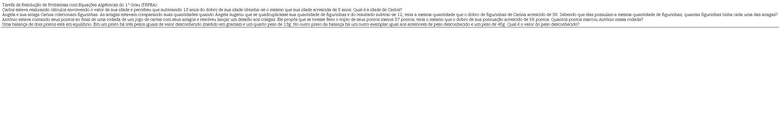 A Tarefa de Resolução de Problemas com Equações Algébricas do 1° grau (TRPEA) é composta por quatro situações-problema que apresentam o mesmo nível de dificuldade, adaptadas de Dante (2007). Os alunos foram solicitados a resolver os problemas individualmente, mas podiam pedir auxílio ao pesquisador para compreender a situação-problema. O auxílio era proporcionado por meio de questionamentos dirigidos aos estudantes, com o objetivo de auxiliá-lo na representação do problema em questão.