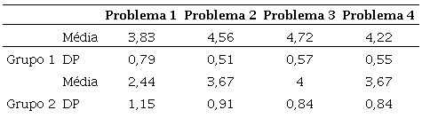Em relação à Tarefa de Resolução de Problemas com Equações algébricas do 1° grau (TRPEA), os estudantes apresentaram uma pontuação média de 15,71 pontos (DP=2,55), com máxima de 20 pontos (+2DP) e mínima de 10 pontos (-2DP), demonstrando, em primeira análise, um bom desempenho na resolução dos problemas. O desempenho médio em cada questão, por grupos, pode ser verificado na Tabela 1, em que se observa um melhor desempenho dos estudantes do grupo 1 (ACC) na resolução dos problemas da TRPEA (lembramos que a pontuação máxima é de 5 pontos em cada problema).