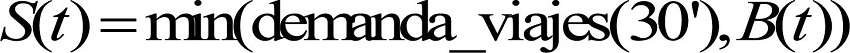 De acuerdo con H(A)2, podemos asumir que el número total de bicicletas que finalmente se mueve en el instante de tiempo t depende de: (a) la demanda potencial de bicicletas cada fracción de 30’ [demanda_viajes(30’)] y (b) del total de bicicletas disponibles en el instante de tiempo t. El total de salidas se puede definir entonces como:
