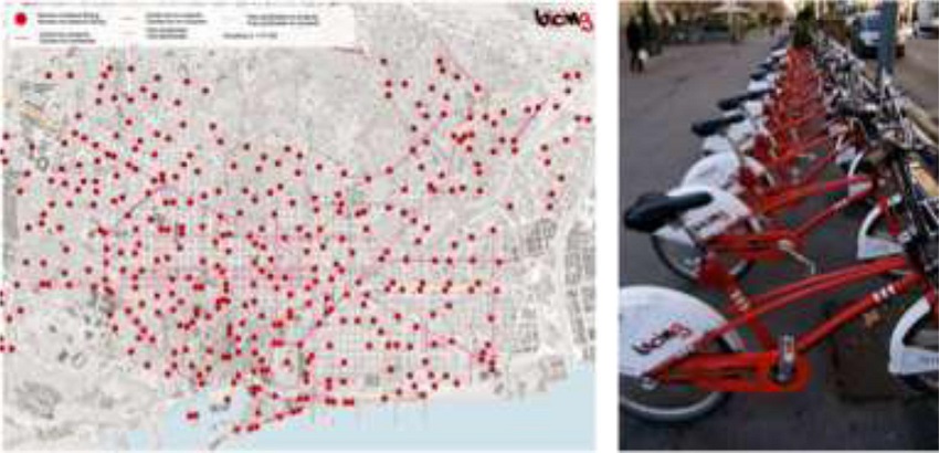Bicing4 es el nombre de un servicio público de uso compartido de bicicletas que se inauguró en Barcelona (España), en 2007. Este servicio, no se trata de un sistema de uso turístico de bicicletas, sino que tiene como objetivo cubrir pequeñas y medianas rutas diarias de los ciudadanos de Barcelona. Dos años después de su inicio, con 200 bicicletas y 15 estaciones, las cifras desbordaron totalmente toda previsión posible, la red dispone actualmente de 400 estaciones (Figura 1) donde recoger y devolver una flota total de 6000 bicicletas distribuidas en todo el sistema.