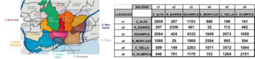 Después de un primer análisis del tráfico de bicicletas entre las distintas estaciones que la empresa nos facilita, los diseñadores (e investigadores) deciden agrupar las estaciones por áreas o zonas de la ciudad según el patrón de comportamiento de estas. Finalmente, se decide considerar seis zonas principales (ver Figura 2). Además, a partir de los datos que Bicing nos proporciona, se puede construir la siguiente tabla que representa la matriz origen-destino (matriz OD) que indica el número potencial de viajes diarios6. Los datos se obtuvieron después de un estudio, durante varios meses, de la demanda de los usuarios de Bicing. Cada dato de la tabla representa el promedio del número total de viajes realizados diariamente que parten de una determinada zona (columnas j) y llegan a otra al final del día, o se quedan en la misma zona (filas i).