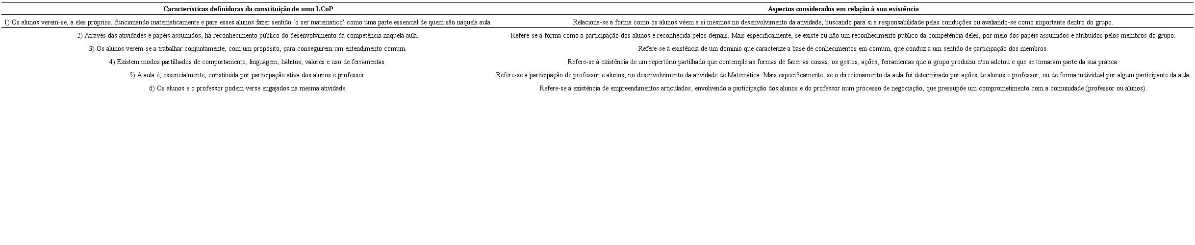 Winbourne e Watson (1998), e posteriormente David e Watson (2008), utilizaram as características apresentadas a fim de analisarem se as práticas construídas em determinadas aulas de Matemática permitiram a constituição de LCoP. Em ambos os casos, as aulas analisadas foram ministradas por professores que não eram os pesquisadores e sem a intenção de constituir uma LCoP.