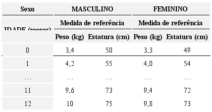 Nesta discussão inicial, um texto informativo, cujo tema central era o desenvolvimento dos bebês, foi disponibilizado à turma. A partir da leitura conjunta do texto, Raiane afirmou: “Eu acho que o que ficaria melhor seria o desenvolvimento do crescimento (altura) e do peso, a quantidade que ela engorda” (gravação em áudio e vídeo da aula, 2013). Como o texto fazia alusão a uma tabela de referência acerca do crescimento dos bebês quanto às variáveis citadas, disponibilizou-se a Tabela 01: