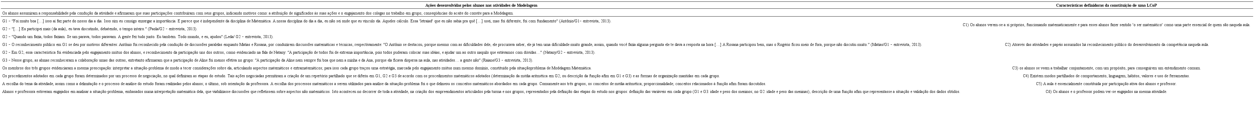 No Quadro 02, apresentamos uma síntese das ações exercidas pelos alunos na atividade de Modelagem Matemática, que evidenciam a constituição de uma LCoP em cada um dos três grupos formados. Para tanto, retomamos algumas considerações realizadas na seção anterior e agregamos afirmações de alguns alunos, obtidas na entrevista final realizada.