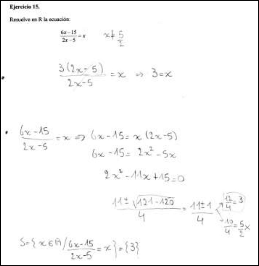 Pudimos ver esto claramente en los casos en los que los estudiantes presentaron dos procedimientos diferentes frente a un mismo ejercicio. En esos casos, a pesar de haber resuelto el ejercicio de una manera no estándar u original o poco común en las clases de matemática, realizaban a continuación un segundo procedimiento que podría considerarse más rutinario o estándar para cotejar si arribaban a la misma respuesta. Mostraron, de esta manera, una escasa confianza en aquellos procedimientos que se alejan de los que se utilizan habitualmente en las aulas. Este tipo de trabajo pudo verse, principalmente, en el trabajo con ecuaciones racionales y con sistemas de ecuaciones.