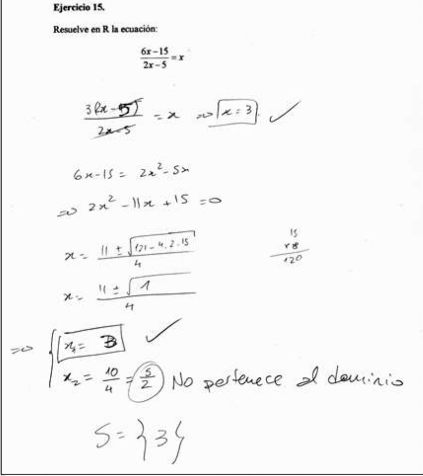En este caso, también creemos que el Estudiante 8 no confía en su primer procedimiento. No está seguro de que la solución hallada de esa manera sea correcta o no confía en que quien vea su trabajo acepte esa forma de resolver la ecuación. Por esto, el estudiante se ve llevado a plantear un segundo procedimiento para resolver la ecuación. Es este segundo intento el que daría cuenta de la presencia de un procedimiento ritual. El estudiante considera que debe cumplir con una determinada secuencia de acciones matemáticas más del tipo estándar, como transformaciones algebraicas y trasposición de términos, obtención de una ecuación de segundo grado que resuelve con la conocida fórmula resolvente. Estas acciones le proporcionan la confianza de que de esa manera arribará a la solución correcta dado que es una secuencia de trabajo bien conocida por él, por encuadrarse en el formato estándar para resolver una ecuación racional. El cumplir la segunda secuencia de acciones, le asegura que la solución a la que arriba es la solución correcta, mientras que parecería no estar seguro de esto luego de aplicar el primer procedimiento.