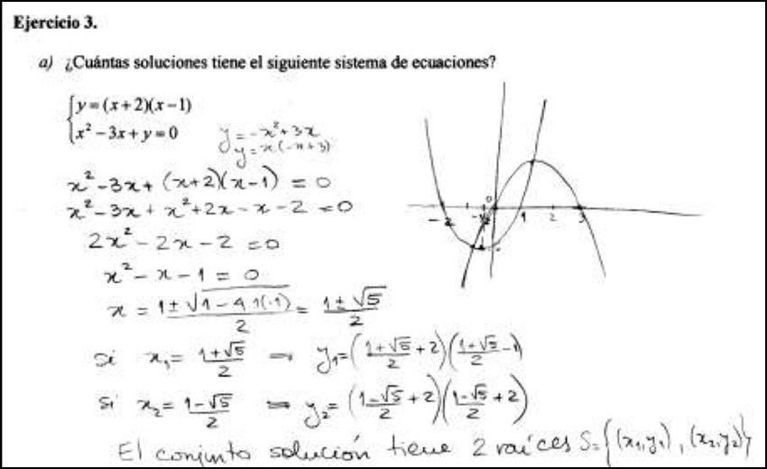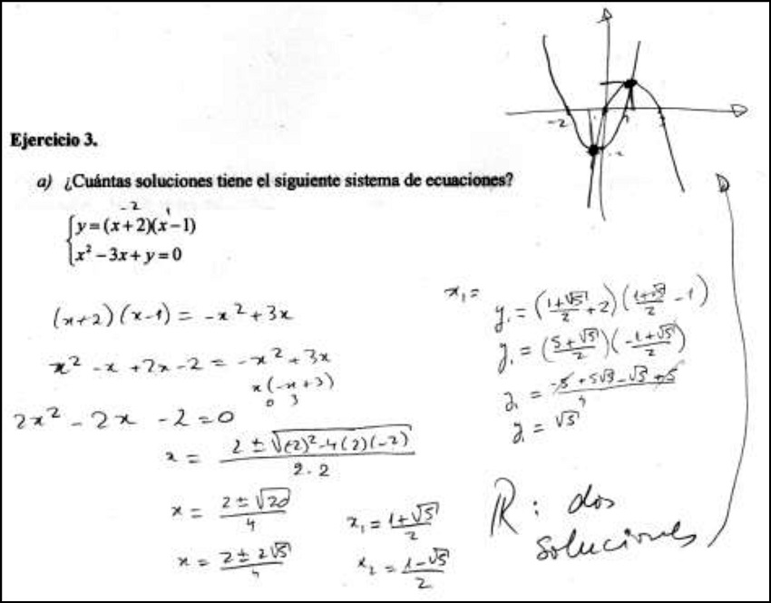 Pensamos que algo similar sucede en las respuestas en que los estudiantes deben hallar la cantidad de soluciones para un determinado sistema de ecuaciones. En ese caso, los estudiantes optan por hallar las coordenadas de los puntos de intersección de manera analítica en la mitad de los cuestionarios (sin considerar los casos en los que hacen dos procedimientos). Aunque no está solicitado en la pregunta, muchos de estos estudiantes, luego de reconocer que hay dos soluciones, intentan hallar las coordenadas de estos puntos. Creemos que es posible interpretar como un ritual este procedimiento, ya que es habitual en las aulas que los ejercicios de este tipo pidan hallar el conjunto solución y no indicar solamente la cantidad de soluciones.