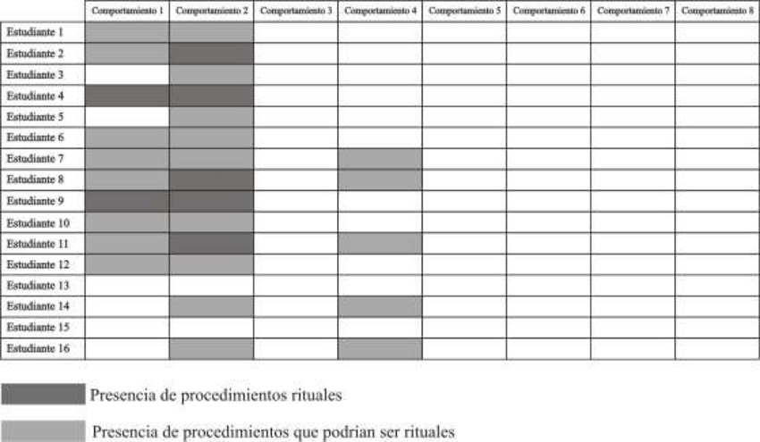 A continuación presentamos, a manera de síntesis, una tabla que permite observar los procedimientos rituales que pudimos evidenciar en las producciones de cada estudiante.