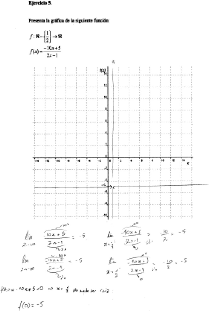 El Estudiante 8 estudió los límites infinitos y los límites laterales en el valor de x que no pertenece al dominio. También intentó hallar la raíz de la función, observó que no tiene, y halló la ordenada en el origen. El estudiante utilizó herramientas habituales y potentes en el contexto del análisis matemático, pero más bien útiles para la obtención de la gráfica de funciones de mayor complejidad. Una vez más, interpretamos que atravesar el ritual de este procedimiento le da al alumno la seguridad de que, por ese medio, obtiene la representación gráfica correcta. En este caso también inferimos que las características del ejercicio activaron procedimientos rutinarios que podrían ser entendidos como rituales en tanto no son para nada necesarios para responder el ejercicio. No obstante, más investigación sería necesaria al respecto, en tanto en este caso, no hay presencia de dos procedimientos distintos para resolver un mismo ejercicio, cómo sí aparece en los ejemplos presentados en la sección anterior.