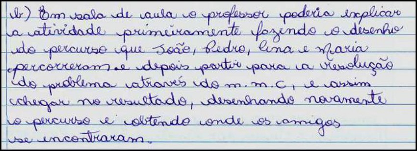 Assim, nesse problema, entendemos que os conhecimentos, entre outros, sobre a fração e suas possíveis representações via desenho, e sobre fração equivalente e cálculo do m.m.c. corresponderam (e correspondem) a conhecimentos prévios. São conhecimentos que devem (deveriam) ser trazidos e retomados para a compreensão do algoritmo da adição (e nos demais) via um trabalho na abordagem da resolução de problemas.