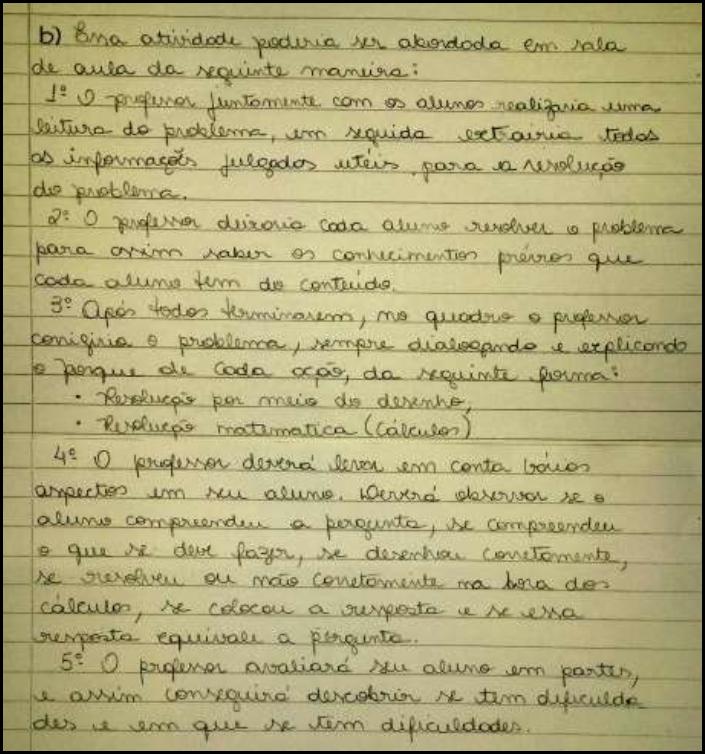 Em aula posterior, a resolução dessa situação, que, neste artigo, passamos a denominar de situação inicial, foi trazida para discussão com a turma. Além disso, foi entregue a cada participante um questionário que lhes permitia assinalar suas dificuldades. Assim, marcaram itens referentes aos erros cometidos nas etapas de resolução de problemas como, por exemplo, se identificaram equívocos no planejamento (estratégia utilizada). Nas explicações, marcaram ações que faltaram na condução das aulas: se propuseram o problema como ponto de partida; se levaram em consideração que deveriam permitir que os alunos apontassem suas estratégias de resolução; se discutiram as estratégias dos alunos; se buscaram articular essas estratégias ao assunto.