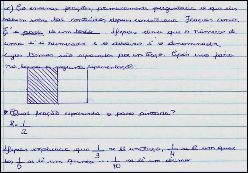 De modo geral, identificamos que apenas 36% das licenciandas contemplaram em suas explicações os quatro aspectos tomados como referência de nossa análise, evidenciando ações no ensino de equivalência de frações na abordagem da resolução de problemas. A Figura 3, abaixo, ilustra um exemplo desse tipo de explicação.
