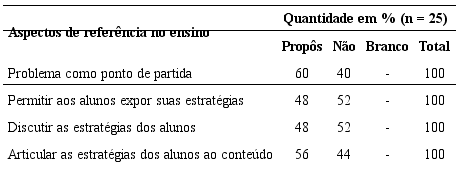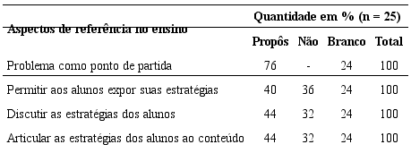 Assim, ao final, 40% das graduandas não mencionaram em suas explicações conduzir um ensino adotando o problema como ponto de partida. Relataram, de modo, geral, aulas que evidenciavam apenas suas participações, tendo como foco a explicação direta do conteúdo ou o uso inicial de desenhos ou o uso preliminar de material concreto. Desse modo, os aspectos de referência no ensino, relacionados a se permitir aos alunos resolverem sozinhos e apresentar suas estratégias, a discutir essas estratégias e a de articulá-las ao novo assunto, tiveram uma baixa porcentagem de indicação.